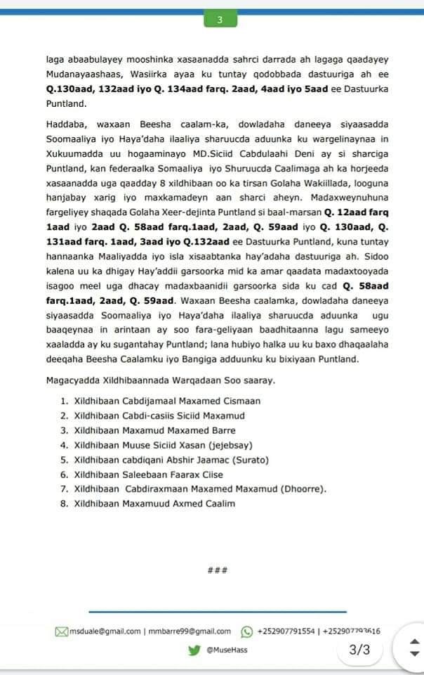 Talaado, December, 08, 2020 (HOL) -8 xildhibaan oo katirsanaa barlamaanka dowlad goboleedka Puntland, kuwaas oo dhawaan xasaanadii laga xayuubiyay ayaa dowladda federalka Soomaaliya iyo beesha caalamka u gudbiyay dacwad ka dhan ah madaxweyne Deni.