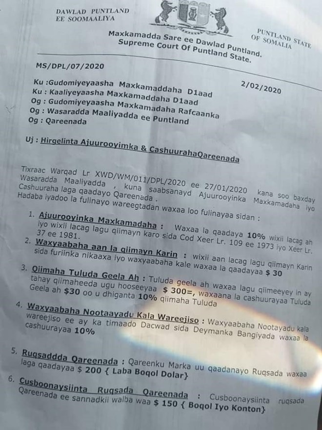 Warqad labadii bishaan kasoo baxay xafiiska guddoomiyaha maxkamada sare ayaa lagu wargaliyay qareenadu in ay bixiyaan ajuurooyin iyo canshuuraad lagusoo rogay ruqsadahooda iyo adeegga sharci ee dadweynaha u qabtaan.