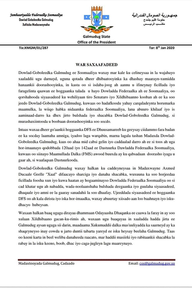 Khamiis, Janaayo, 09, 2020 (HOL)-Madaxweynaha Dowlad gobolleedka Galmudug Axmed Ducaale Geelle Xaaf ayaa ku eedeeyay dowladda Soomaaliya in ay afduubtay sida uu hadalka ku dhigay maamul u sameynta Galmudug.