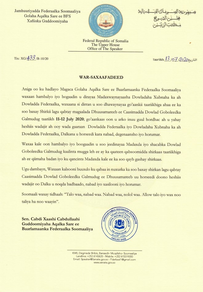 Isniin, Luulyo 13, 2020 (HOL) - Guddomiyaha Golaha Aqalka Sare ee Baarlamaanka Federaalka Soomaaliya Senatar Cabdi Xaashi Cabdullahi ayaa War-saxaafadeed ka soo saaray Shirkii lagu qabtay magaalada Dhuusamareeb ee Caasimadda Dowlad Goboleedka Galmudug taariikh 11-12 July 2020.