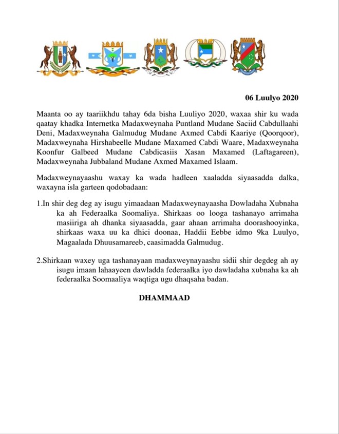Isniin, July 6, 2020 (HOL) - War murtiyeed kooban ayaa lagasoo saaray shirkii dhexmaray madaxweynayaasha dowlad goboleedyada Soomaaliya, kaasoo looga hadlayay arimaha doorashada Soomaaliya.