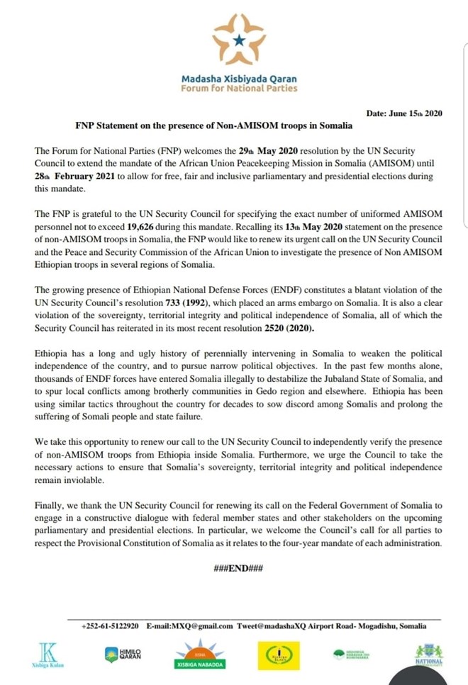 Talaado, Juun 16, 2020 (HOL) - Madasha Xisbiyada qaran ee dalka ayaa war ay soo-saareen waxay ku taageereen codsigii 13-dii-May ee sanadkaan ee Golaha ammaanka ee Qaramada midoobe kaas oo ku saabsanaa in ciidamada Itoobiya ee aan ka tirsaneyn howl-galka midowga Afrika ee Soomaaliya laga saaro waddanka.