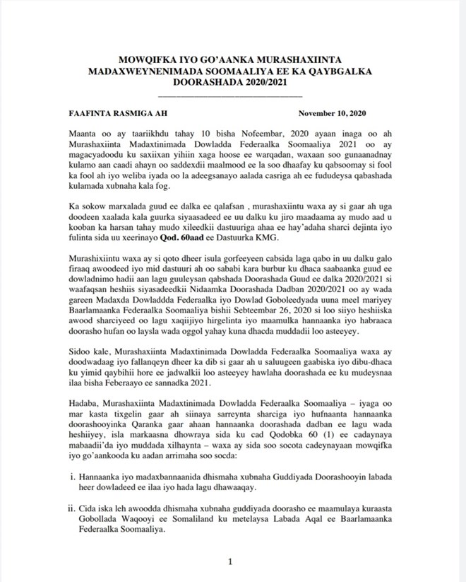 Talaado, November, 10, 2020 (HOL)- Qoraal ka soo baxay qaar ka mid ah musharixiinta u taagan xilka madaxweynaha Soomaaliya ayaa lagu qaadacay ka qeybgalka doorashada 2020-21, iyaga dood ka keenay sida loogu kalsoonaan karo guddiyada ay dowladdu u saartay doorashada.