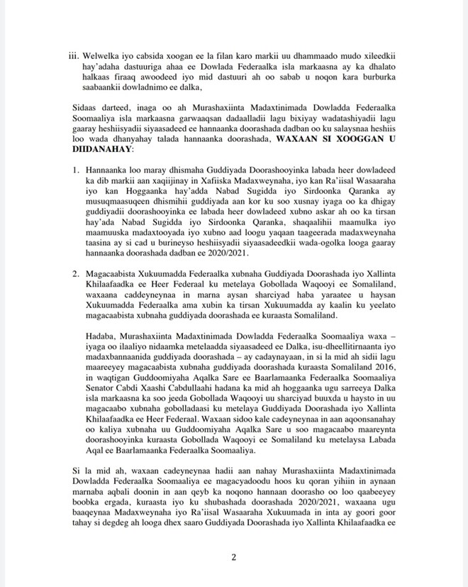 ‘’Waxaan ku baaqeynaa in si deg deg ah guddiyada looga dhax saaro xubnaha Askarta ah ee ka tirsan hay’adda nabad-sugida Qaranka, xubnaha shaqaalaha dowladda iyo waliba kuwa ku caanbaxay taageerrada madaxweyne Farmaajo’’ ayaa lagu yiri qoraalka