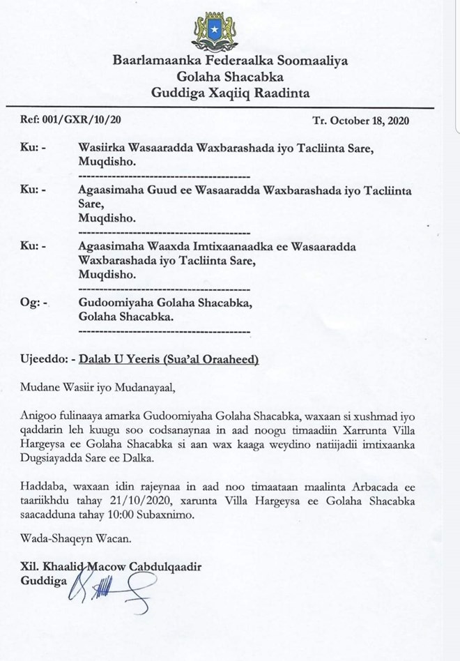 Axad, October 18, 2020 (HOL) - Guddiga xaqiiqo raadinta barlamaanka Soomaaliya ayaa u yeeray sii hayaha wasiirka waxbarashada Soomaaliya Cabdullahai Goodax Barre, agaasimihiisa guud iyo agaasimaha imtixaanaadka.