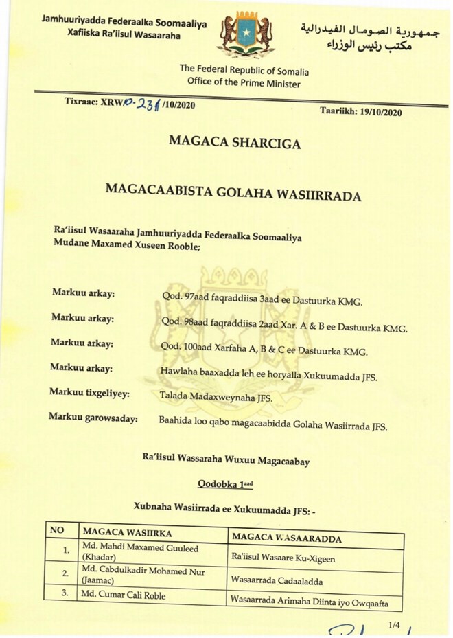 Isniin, October 19, 2020 (HOL) - Raysal wasaaraha Soomaaliya Maxamed Xuseen Rooble ayaa caawa magacaabay golaha wasiiradda xukuumada Soomaaliya, kuwaas oo intooda badan ah wasiiradda xukuumadii hore Ee Kheyre.