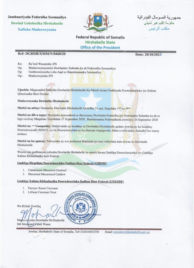 Axad, October, 25, 2020 (HOL)- Madaxweynaha Dowlad Gobolleedka Hirshabeelle Mudane Maxamed Cabdi Waare ayaa wareegto uu soo saaray ku magacaabay xubnaha maamulkiisa ku matalaya Guddiyada Doorashada heer Federaal.