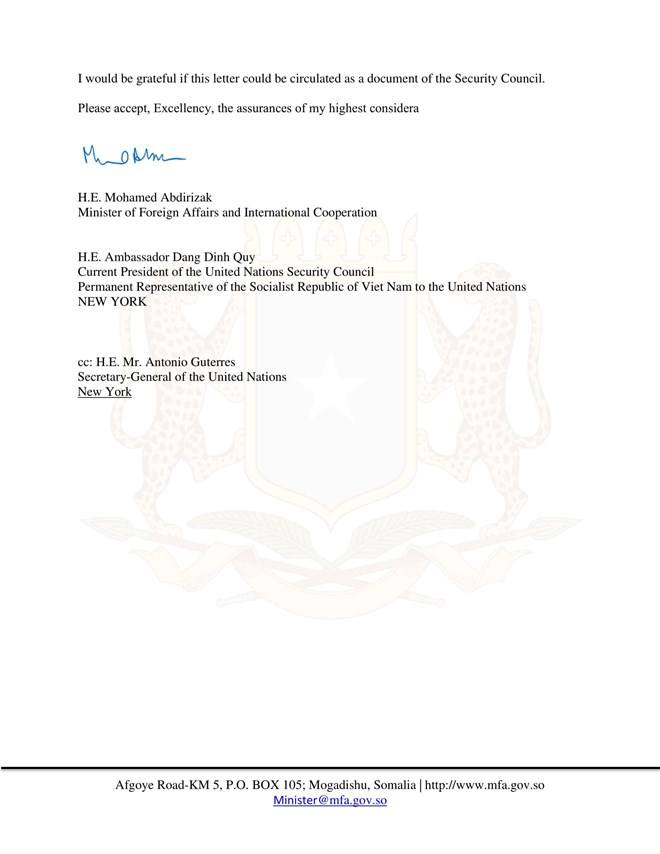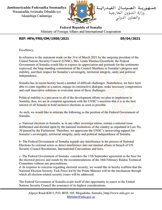 Sabti, April, 10, 2021 (HOL) -Qoraalkan oo loo dirtay Golaha Amaanka Qarramada Midoobey ayeey dowladda Soomaaliya uga digtay in faragalin toos ah caalamku ku yeeshaan arrimaha gudaha Soomaaliya gaar ahaan doorashada oo ah ayaa lagu yiri qoraalka mid Soomaalida u taalla.