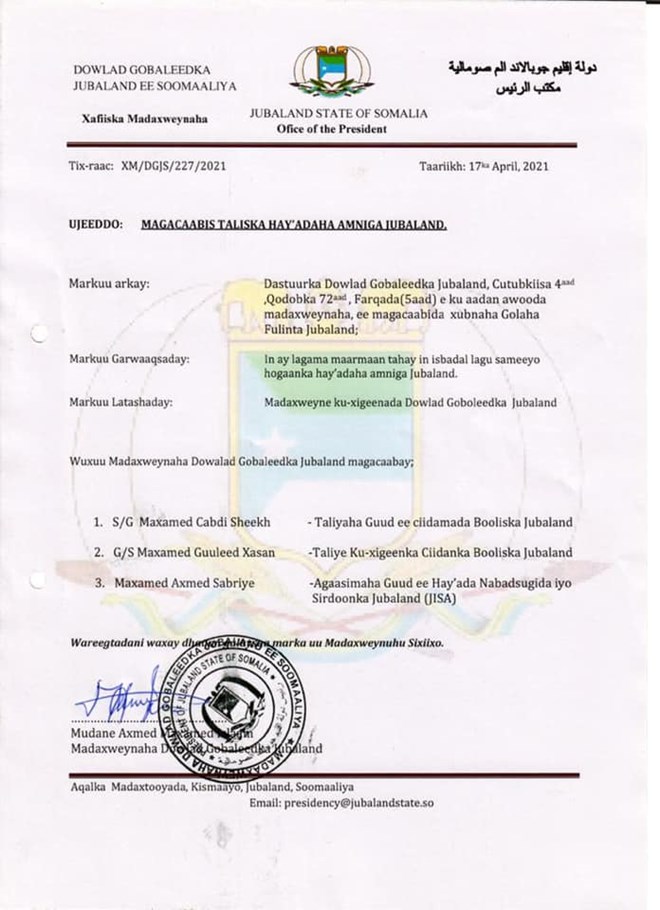 Hoos ka akhriso Wareegtada kasoo baxday Xafiiska Madaxweynaha Jubbaland Axmed Madoobe.