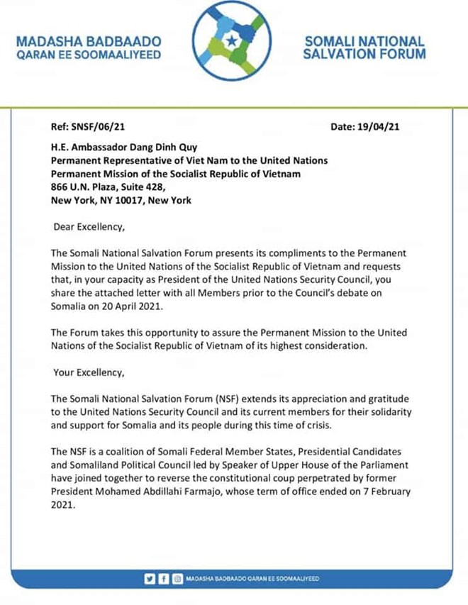 newsinsideMadasha Badbaado Qaran ayaa warqadda aay direen waxay ku saabsaneed sida aay uga soo horjeedaan muddo kordhinta Golaha shacabka aay u sameeyeen madaxweyne Maxamed Cabdullaahi Farmaajo iyo waliba khilaafka ka taagan arrimaha doorashooyinka, iyagoona codsaday in fariintooda laga hor aqriyo Golaha Amaanka Qaramada Midoobay.