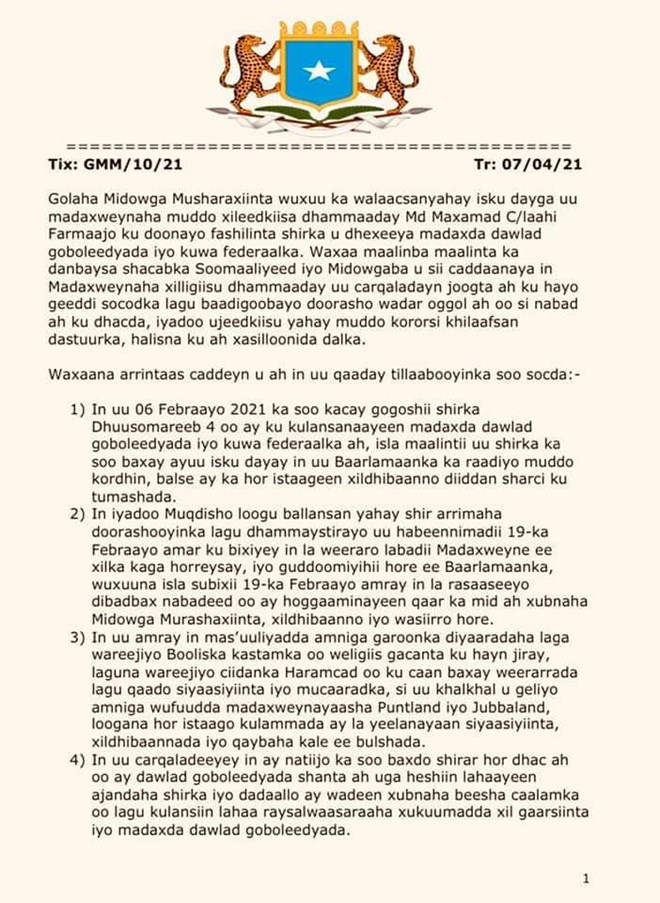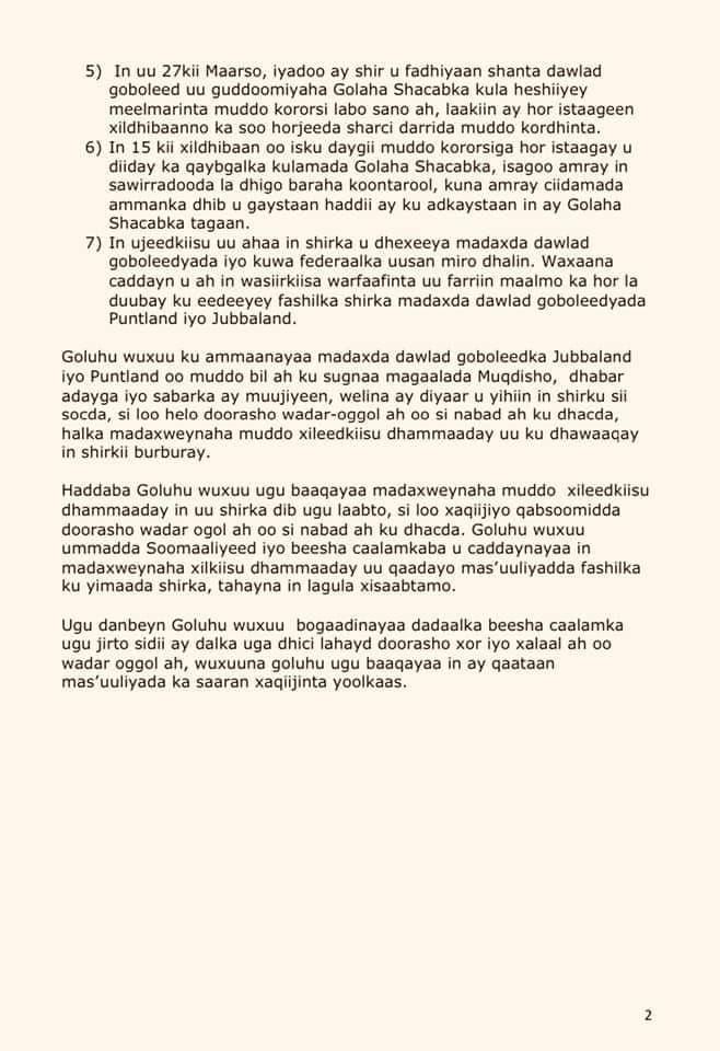 Goluhu wuxuu ku ammaanayaa madaxda dawlad goboleedka Jubbaland iyo Puntland oo muddo bil ah ku sugnaa magaalada Muqdisho, dhabar adayga iyo sabarka ay muujiyeen, welina ay diyaar u yihiin in shirku sii socda, si loo helo doorasho wadar-oggol ah oo si nabad ah ku dhacda, halka madaxweynaha muddo xileedkiisu dhammaaday uu ku dhawaaqay in shirkii burburay.