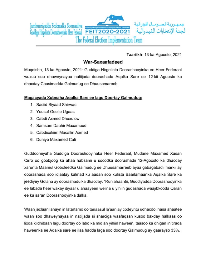 Jimco, Agoosto, 13, 2021 (HOL) - Guddiga hirgelinta Doorashooyinka ee Heer Federaal ayaa ka hadlay natiijada doorashada Aqalka Sare ee maalintii shalay ka dhacday Caasimadda Galmudug ee Dhuusamareeb, iyadoo lagu doortay 6 sanator oo kala ah:- 1. Saciid Siyaad Shirwac 2. Yuusuf Geelle Ugaas 3. Cabdi Axmed Dhuxulow 4. Samsam Daahir Maxamuud 5. Cabdixakiim Macallin Axmed 6. Duniyo Maxamed Cali.