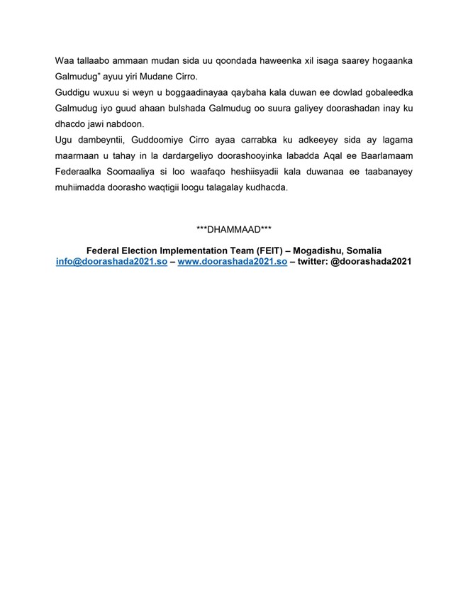 Guddoomiye Cirro ayaa carrabka ku adkeeyey sida ay lagama maarmaan u tahay in la dardargeliyo doorashooyinka labadda Aqal ee Baarlamaam Federaalka Soomaaliya si loo waafaqo heshiisyadii kala duwanaa ee taabanayey doorasho waqtigii loogu talagalay ku dhacda.