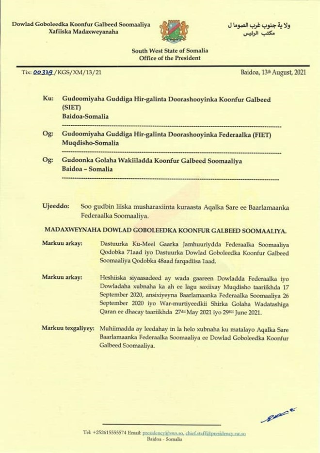 Sabti, Agoosto, 14, 2021 (HOL) - Madaxweynaha maamulka Koonfur Galbeed Cabdicasiis Xasan Maxamed Laftagareen ayaa soo saaray liiska xubnahii ka dhinaa doorashada kuraasta Aqalka sare ee deegaan doorashadooda tahay Koonfur Galbeed Soomaaliya.