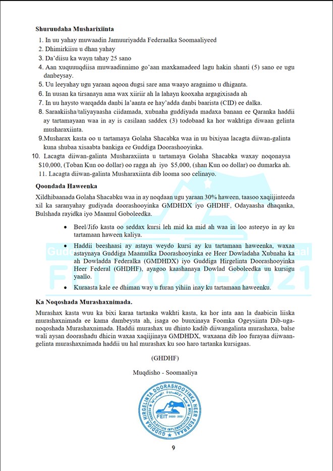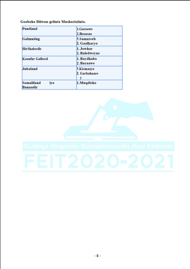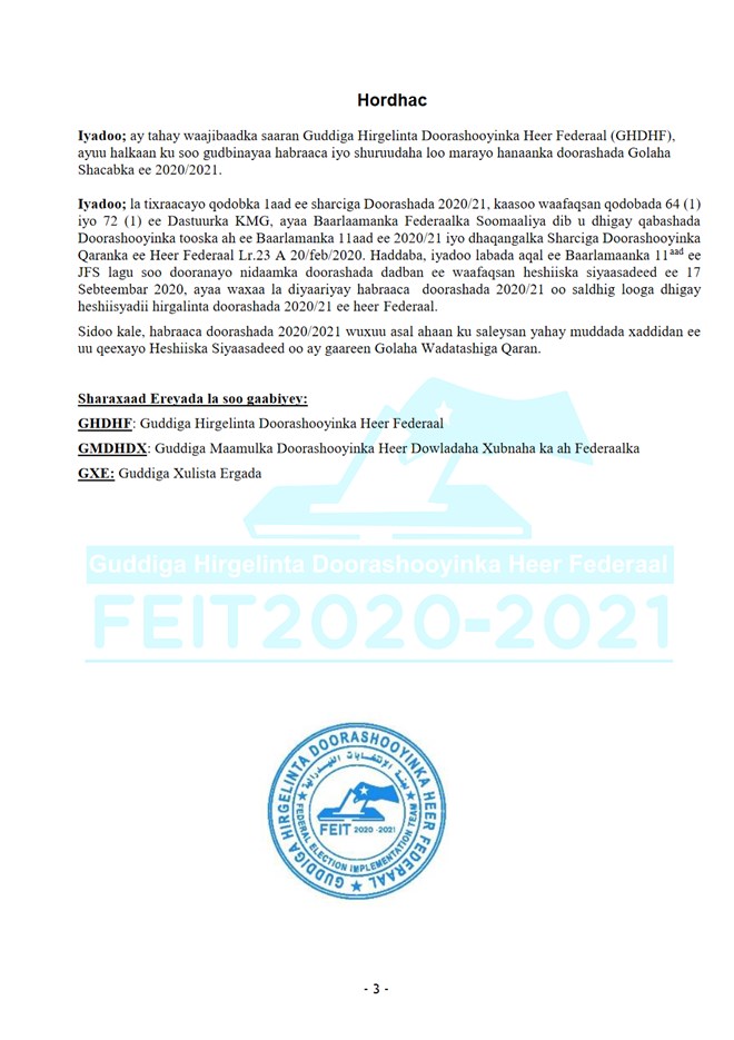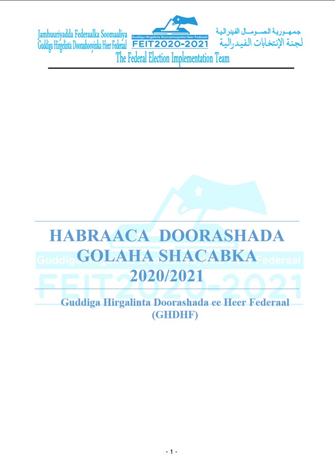 Talaado , Agoosto,17, 2021 (HOL) - Guddiga hirgalinta doorashooyinka Soomaaliya ayaa maanta soo saaray hab-raaca lagu maamulayo doorashooyinka aqalka hoose ama golaha shacabka ee dhicidoonta horraanta bisha 9-aad.