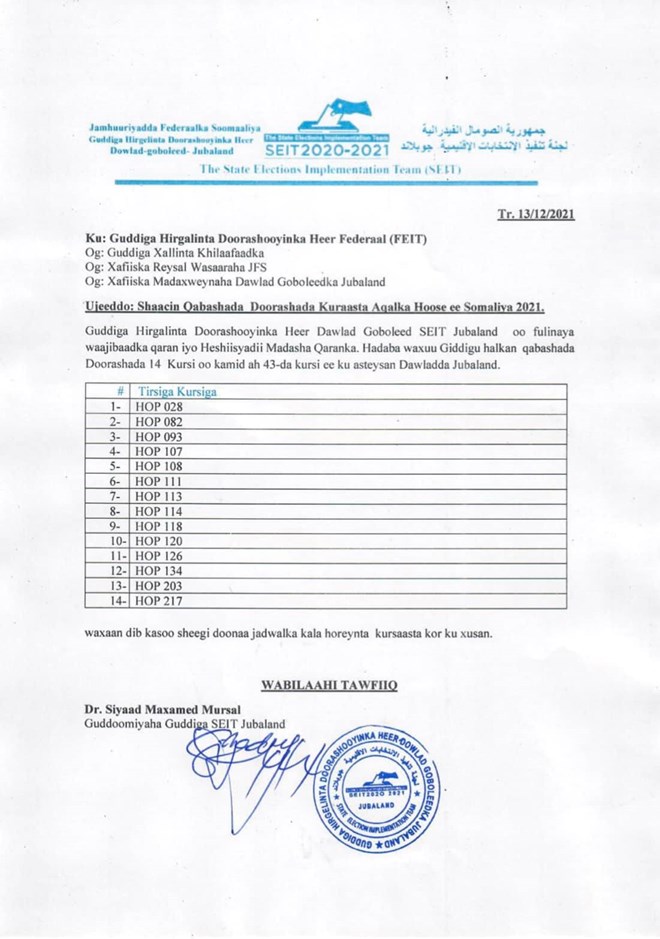 Talaado, December, 14, 2021 (HOL) - Guddiga doorashooyinka heer dowlad goboleed ee Jubbaland, ayaa si rasmi ah u shaaciyay qabashada doorashada 14 Kursi oo kamid ah 43-da kursi ee ku asteysan deegaannada Jubaland.