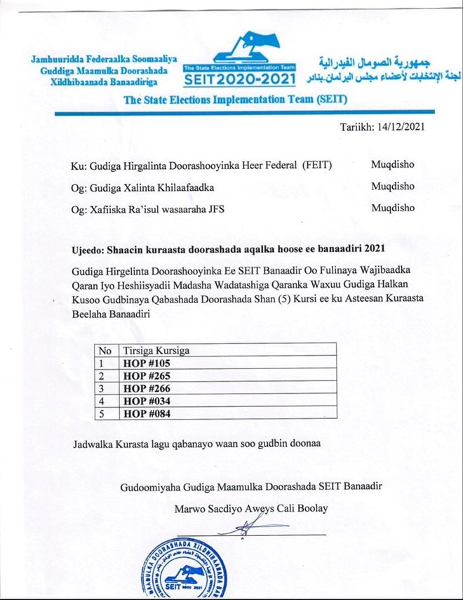 Talaado, December, 14, 2021 (HOL) - Guddiga hirgelinta doorashada kuraasta Golaha Shacabka Beelaha Banaadiriga ayaa ku dhawaaqay qabashada 5 kursi oo ka mid ah kuraasta Golaha Shacabka oo lagu dooranaayo magaalada Muqdisho.