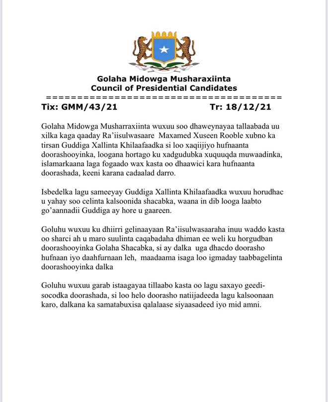 Sabti, December, 18, 2021 (HOL) - Golaha Midowga Musharaxiinta ayaa soo dhoweeyay tallaabada uu raysal wasaaraha Soomaaliya xilka kaga qaaday qaar katirsanaa guddigii xallinta Khilaafaadka doorashada, kuwaas oo saacaddo ka hor xil ka qaadistooda saxaafadda ka sheegay in shaqadooda faro galin lagu hayo.