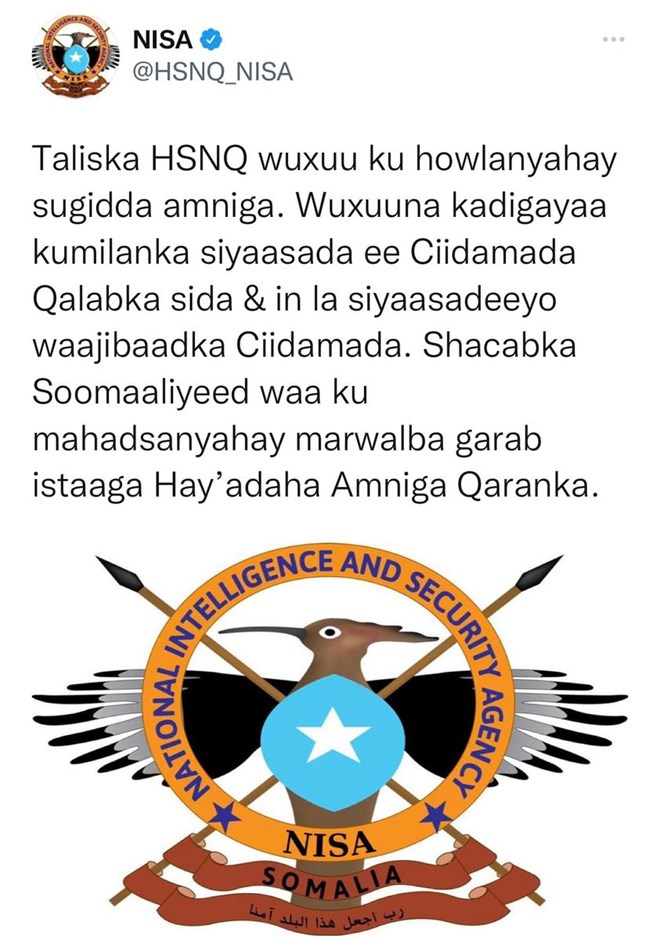 Jimco, December, 31, 2021 (HOL) - Hay’adda nabad sugida iyo sirdoonka qaranka Soomaaliya ee NISA, ayaa soo saartay digniin ay ciidamadeeda uga digayso inay ku milmaan Siyaasadda iyo in la siyaasadeeyo waajibaadka Ciidamada.