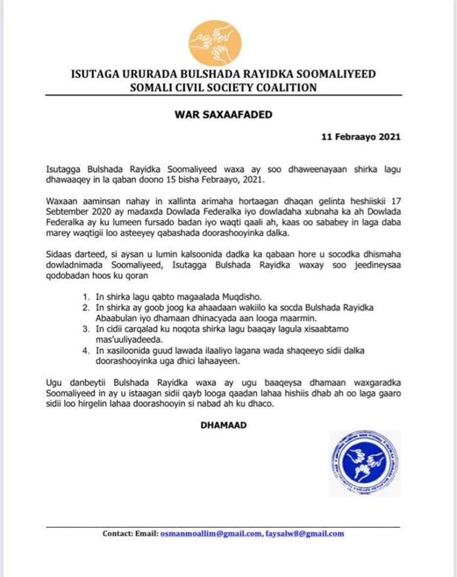 Jimco, Feberaayo, 12, 2021 (HOL) - Ururrada bulshada rayidka oo war ka soo saaray shirka wadatashiga ee uu dhawaan ku baaqay madaxweynaha Dowladda Soomaaliya Maxamed Cabdullaahi Farmaajo ayaa codkooda ku biiriyay in shirkan lagu qabto magaalada Muqdisho, kaddib markii uu madaxweynuhu sheegay in uu ka dhacayo magaalada Garoowe.