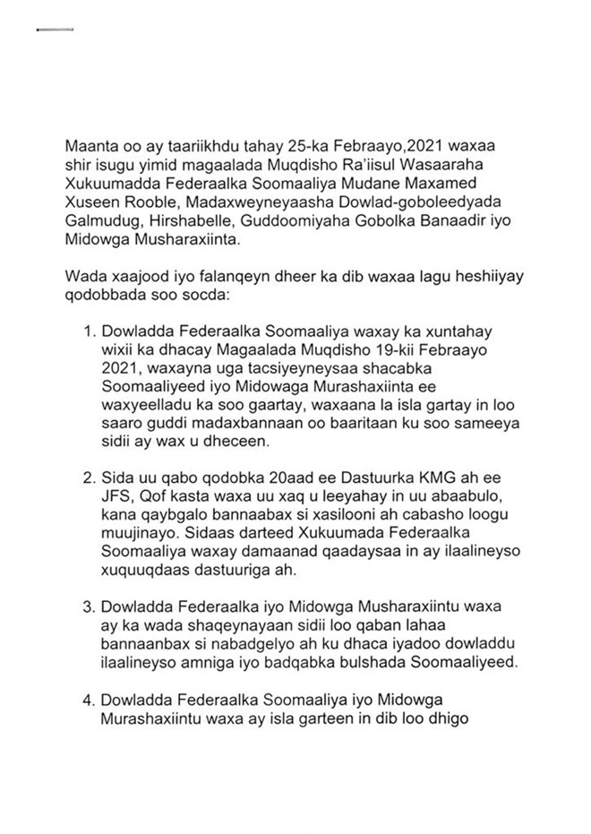 Khamiis, Feberaayo, 25, 2021 (HOL) - Warmurtiyeed ka kooban ilaa lix qodob ayaa ugu danbeyntii laga saaray shir saacado badan qaatay oo Hotel Decale ee magaalada Muqdisho uga soconayay Ra'iisal Wasaaraha Xukuumadda Soomaaliya Maxamed Xusseen Rooble iyo midowga Musharixiinta.