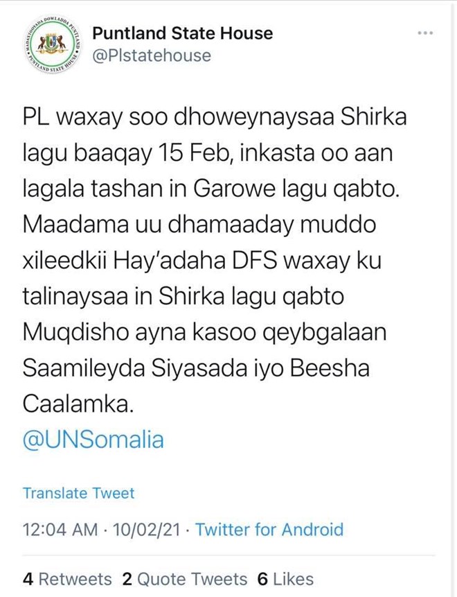 “Puntland waxay soo dhaweynaysaa shirka lagu baaqay 15 Febraayo, inkastoo aan lagala tashan in Garoowe lagu qabto, maadama uu dhammaaday mudo xileedkii hay’addaha Dastuuriga ah ee DFS, waxayna ku talinaysaa in Shirka lagu qabto Muqdisho, ayna kasoo qayb galaan Saamileyda Siyaasada iyo Beesha Caalamka,” ayaa lagu yiri qoraalka Puntland.