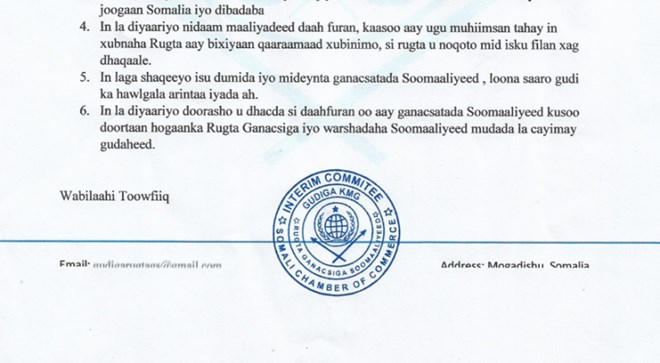 Wasiirka Ganacsiga ayaa kala diray guddiggii Rungta Ganacsiga iyo Warshadaha Soomaliyeed oo dhinacooda ku gacan-seyray go'aanka Wasiirka, hasse ahaatee qoraal ka soo baxay guddigan cusub ee KMG ayaa lagu sheegay in ay dardar-galinayaan howlaha culus ee hor yaala ee loo idmaday.