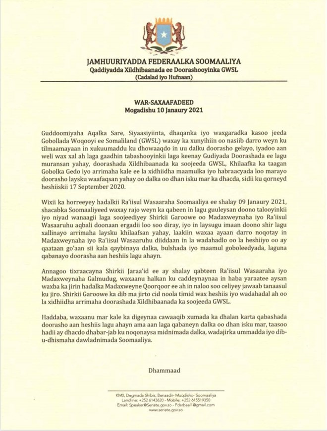 Axad, Janaayo, 10, 2021 (HOL) - Gudoomiyaha Aqalka Sare ee Soomaaliya, Cabdi Xaashi Cabdullaahi ayaa wax kama jiraan ku tilmaamay hadalka Madaxwayne Qoor Qoor ee ahaa in dadka tabashada ka qaba hannaanka doorashada uu kusoo celiyey jawaab tanaasul ku jiro oo ka timid madaxda dowladda federalka.