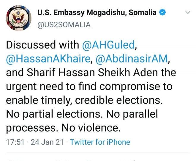 Axad, Janaayo, 24, 2021 (HOL) -War ka soo baxay safaaradda Mareykanka ee Soomaaliya ayaa looga hadlay doorashada Soomaaliya iyo walwalka Mareykanku uu ka qabo is mari-waaga ka taagan qabashada doorasho leysla ogol yahay.
