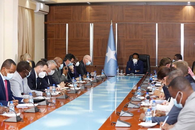 Sabti, Janaayo, 30, 2021 (HOL) - Madaxweynaha Soomaaliya Maxamed Cabdullaahi Farmaajo ayaa maanta Madaxtooyada Qaranka ku qaabilay Danjireyaasha iyo Wakiillada Beesha Caalamka ee fadhigoodu yahay Muqdisho.