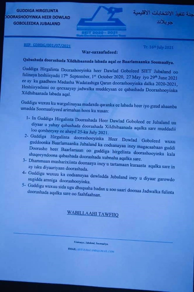 Jimco, Luulyo, 16, 2021 (HOL) - Guddiga hirgalinta doorashooyinka Jubbaland, ayaa maanta war-saxaafadeed qabtay ay ku sharraxayaan halka ay wax marayaan iyo shaqooyinkii u qabsoomay muddadii uu guddigu jiray.