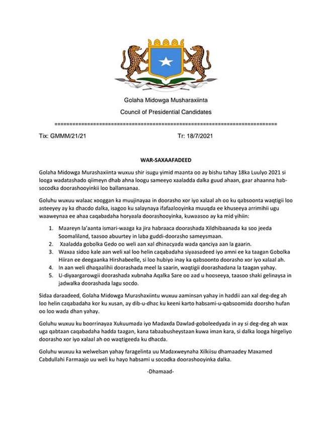 Golaha midowga Musharaxiinta ayaa bayaankooda ku sheegay iney wali jirto faragilin uu madaxweyne Farmaajo ku haayo hanaanka doorashada.