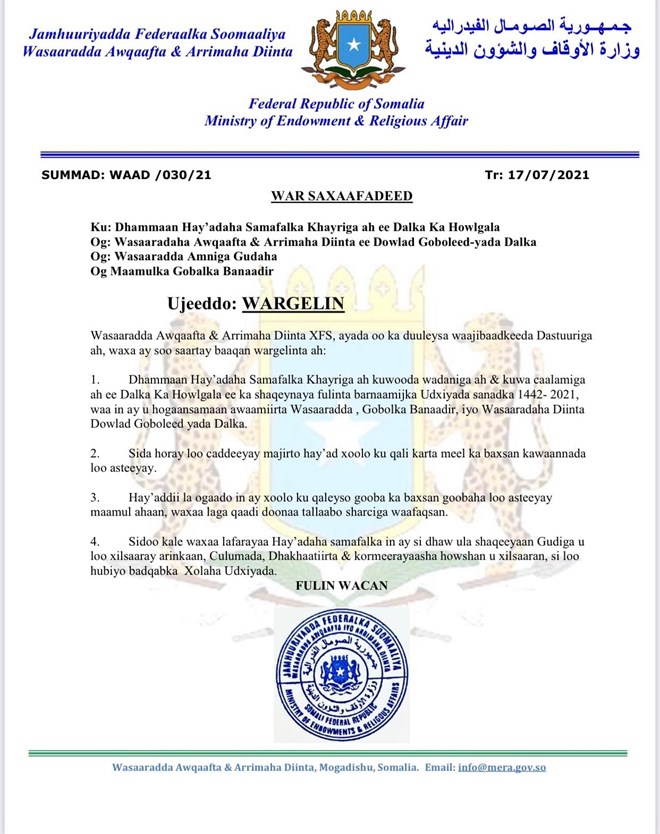 Isniin, Luulyo, 19, 2021 (HOL) - Iyadoo maalinta berito ah ay ku beegan tahay maalinta koowaad ee Ciida Carafo ayaa wasaaradda Diinta iyo Awqaafta Xukuumadda fedaraalka Soomaaliya ay soo saartay amaro ku saabsan Xoolaha lagu qalo xaafadaha inta lagu guda jiro gudashada waajibaadka Ciida Carafo.