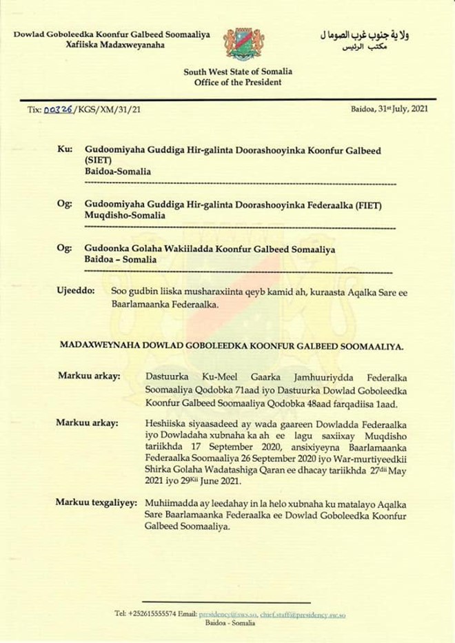 Sabti, Luulyo, 31, 2021 (HOL) - Madaxweynaha maamul goboleedka Koofur Galbeed Soomaaliya Cabdicasiis Xasan Maxamed Laftagareen ayaa soo gudbiyay liiska Shan kursi oo ka mid ah kuraasta lagu tartamayo ee Aqalka sare xubnaha ku matalaya maamulka Koofur Galbeed.