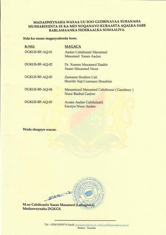 newsinsideShanta kursi ee uu soo gudbiyay madaxweyne Laftagareen ee noqonaya kuraastii ugu horeysay ee lagu tartami doono ee maamulka Koofur Galbeed ayaa laba ka mid ah Shanta kursi waxaa ku tartami doono haween.