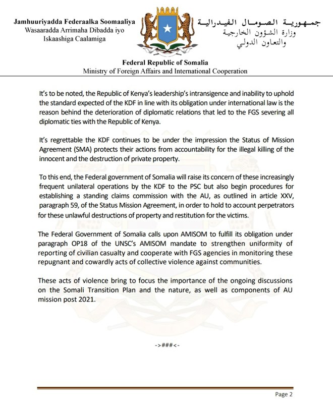 "Dowladda Federaalka Soomaaliya (FGS) waxay si adag u cambaareyneysaa duqeymaha joogtada ah ee ay geysanayaan diyaaradaha dagaalka Kenya ee lagu dilayo laguna dhaawacayo dadka rayidka ah ee Soomaaliya. Duqaymahii ka dhacay gobolka Gedo, Jubaland State, 3da Juun 2021, waa tusaalihii ugu dambeeyay ee howlgalada Ciidamada Difaaca Kenya (KDF) ee sababay dhimashada iyo curyaaminta dadka rayidka ah, oo ay ku jiraan haweenka iyo caruurta. Taas waxay astaan aan wanaagsaneyn u noqonaysaa nidaamka howlgalada ciidamada cirka Kenya." ayaa lagu yiri bayaanka.
