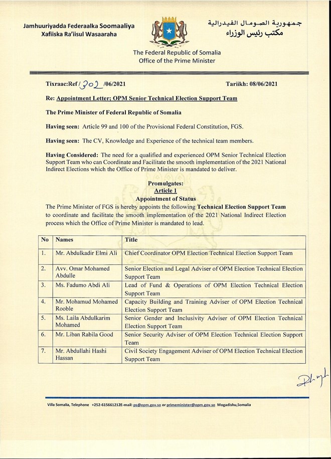 Arbaco, Juun, 9, 2021 (HOL) - Raysal wasaaraha Soomaaliya Maxamed Xuseen Rooble ayaa magacaabay guddi sare ee farsamo oo u qaabilsan hirgelinta arrimaha doorashooyinka dalka.