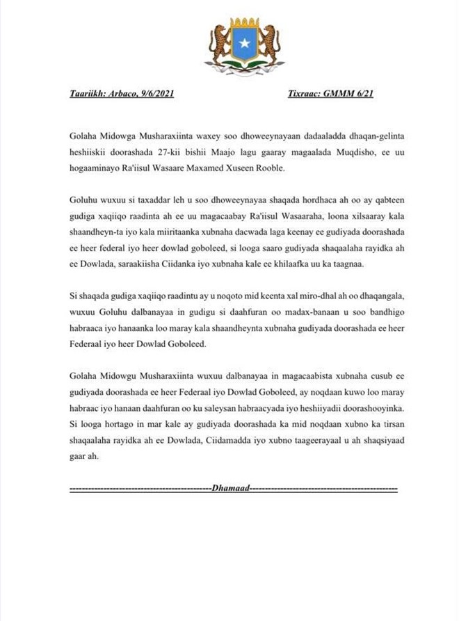 Arbaco, Juun, 9, 2021 (HOL) - Golaha Midowga Musharaxiinta ayaa soo dhoweeyay tallaabooyinka ay qaadeen guddiga xaqiiqo raadinta ah ee uu magacaabay Ra’iisul Wasaaraha ee loo xil saaray kala shaandheynta xubnaha dacwada laga keenay ee guddiyada doorashada heer Federaal iyo heer Dowlad Goboleed.