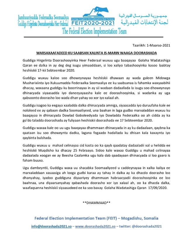 Isniin, Maarso, 01, 2021 (HOL) - Guddiga doorashooyinka heer federaal ayaa ugu baaqay golaha Wadatashiga Qaran ee dalka in ay deg deg isugu yimaaddaan, si loo xalliyo tabashooyinka kasoo laabtay heshiiskii 17-kii Sebteembar 2020.