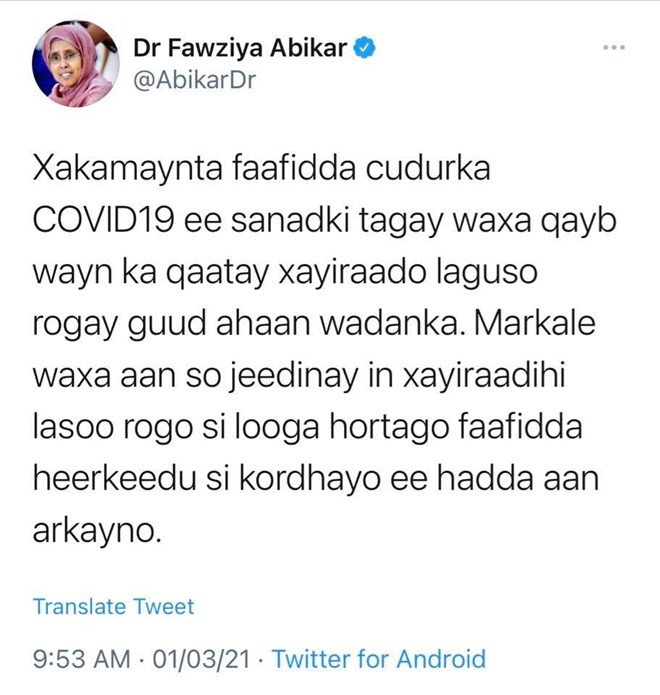Wasiirka caafimaadka oo qoraal kooban soo dhigtay barteeda twitterka, ayaa sheegtay in xayiraada ay tahay habka ugu wanaagsan ee looga hortagi karo faafida cudurka COVID-19 .