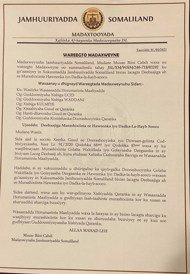 Isniin, Maarso, 01, 2021 (HOL) - Madaxweynaha Somaliland Muuse Biixi Cabdi ayaa waxa uu wareegto Madaxweyne ku go’aamiyey in Xukuumadda Somaliland bixiso lacagta Deebaajiga ah ee Murashixiinta Haweenka iyo Dadka la heyb sooco.