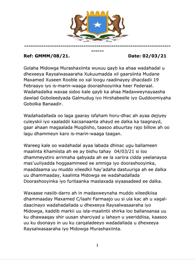 Talaado, Maarso, 02, 2021 (HOL) - Golaha midowga musharrixiinta madaxweynaha Soomaaliya ayaa ku eedeeyay madaxweynaha muddo xilleedkiisu dhamaaday ee Farmaajo inuu fashilinayo wadahalada u socda iyaga iyo raysal wasaaraha Soomaaliya, Maxamed Xuseen Rooble.