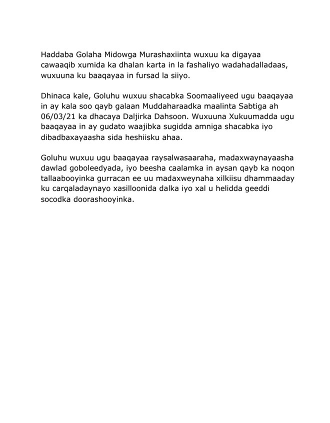 Waxay sidoo kale caddeeyeen in uu qabsoomayo mudaharaadka ay ku baaqeen oo maalinta sabtida ah ka dhicidoona daljirka Dahsoon, waxayna shacabka ka dalbadeen inay kasoo qeyb galaan oo taageeraan mowqifkooda.