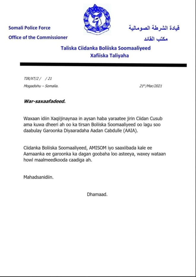 Axad, Maarso, 21, 2021 (HOL) - Hoggaanka Ciidanka Booliska Soomaaliya ayaa beeniyay in ciidamo cusub oo booliis ah la geeyay garoonka diyaaradaha Aadan Cabdulle (AAIA).