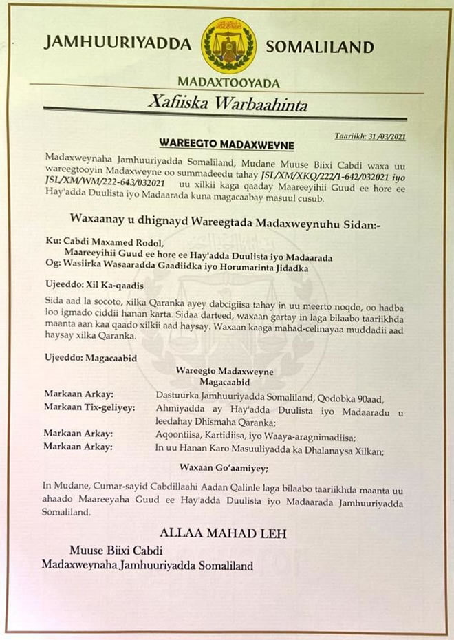 newsinside“Sida aad la socoto, xilka Qaranka ayey dabcigiisa tahay in uu meerto noqdo, oo hadba loo igmado ciddii hanan karta. Sidaa darteed, waxaan gartay in laga bilaabo taariikhda maanta aan kaa qaado xilkii aad haysay. Waxaan kaaga mahad-celinayaa muddadii aad haysay xilka Qaranka.” ayuu Madaxweyne Biixi ku sheegay wareegtadiisa.