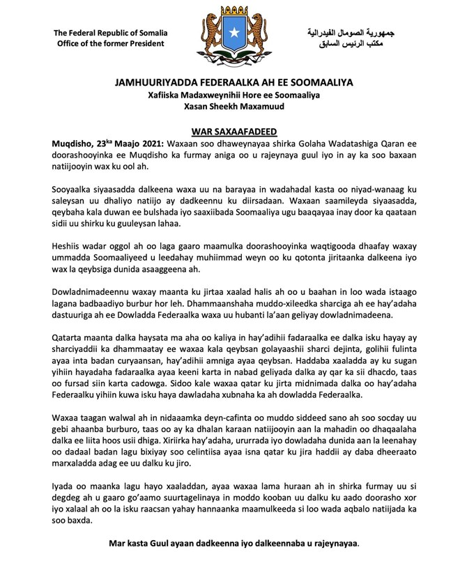 "Khatarta manta dalka heysata ma ahan oo kaliya in hay'adahii Fedaraalka ee dalka isku hayay ay sharciyada ka dhammaatay ee waxaa kala qeybsan golayaasha sharci dejinta, golahii fulinta oo inta badan cuuryaansan, hay'adahii amniga ayaa kala qeybsan, hadaba xaalada aay ku sugan yihiin hay'adaha Fedaraalka ayaa keeni karta in nabadgalyeda dalka aay qar kasii dhacdo, taas oo fursad siin karta cadawga" ayaa lagu yiri qoraalka madaxweynahii hore ee Soomaaliya Xasan Sheekh Maxamuud.