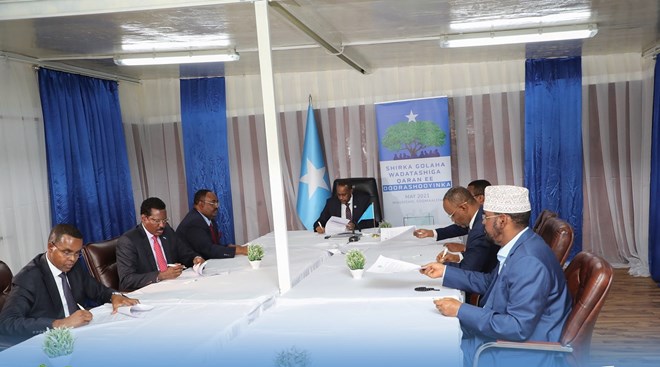 Khamiis May, 27, 2021 ( HOL ) - Ra'iisul Wasaaraha Soomaaliya, hogaamiyaasha dowlad goboleedyada iyo gudoomiyaha gobolka Banaadir ayaa kala saxiixday heshiiska hanaanka doorashooyinka dalka sida laga soo xigtay xafiiska RW.