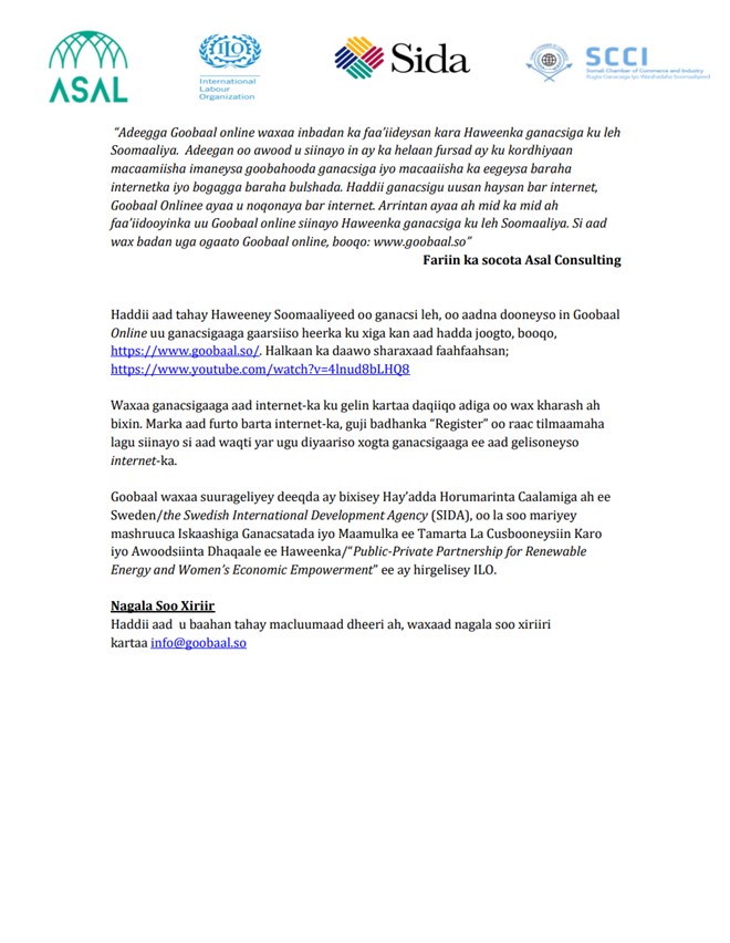 Talaado, November, 23, 2021 (HOL) - Shirkadda la talinta Asal Consulting, oo kaashaneysa Rugta Ganacsiga iyo Warshadaha Soomaaliyeed iyo Ururka Shaqaalaha adduunka, ayaa waxay si rasmi ah u daah fureen Goobaal Online, oo ah adeeg loogu tala galay ganacsiyada ay leeyihiin Haweenka Soomaaliyeed oo doonaya in ay kobciyaan ganacsigooda.