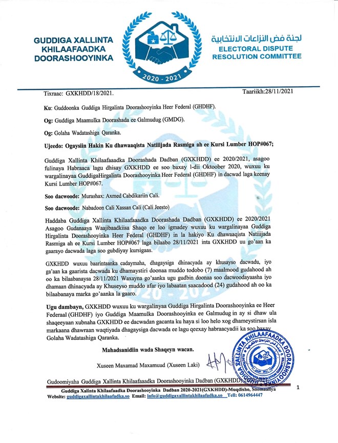 Axad, November, 28, 2021 (HOL) - Guddiga xallinta khilaafaadka doorashada ayaa amray in la hakiyo natiijada kursiga sumadiisu tahay 067 ee uu ku guulaystay taliyaha kumeel gaarka ah ee hay’adda NISA, Kornayl Yaasiin Fareey.