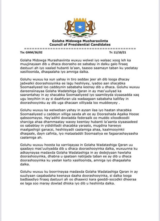 Isniin, October, 11, 2021 (HOL) - Golaha Midowga Musharaxiinta Madaxweynaha Soomaaliya ayaa war qoraal ah oo ay soo saareen waxay ku sheegeen iney walwal aad u weyn ka qabaan dib u dhaca doorshada iyo tafaraaruqa siyaasadeed ee ka jira dalka oo ay sheegeen in xaalad hubaanti la'aan dhanka doorashooyinka uu dalka galay.